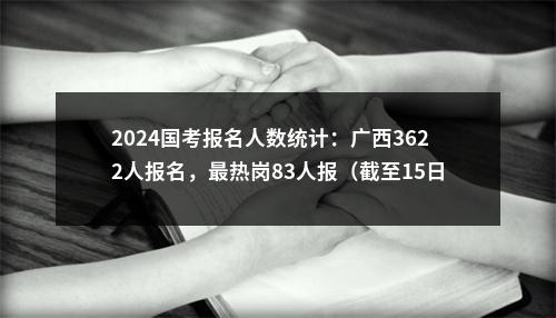 截至10月15日16时,2024国考职位中工作地点在广西的职位已有3622人报名,已有11人通过审核。下面是截至10月15日16时,2024国考广西地区报名数据统计分析,供考生参考: